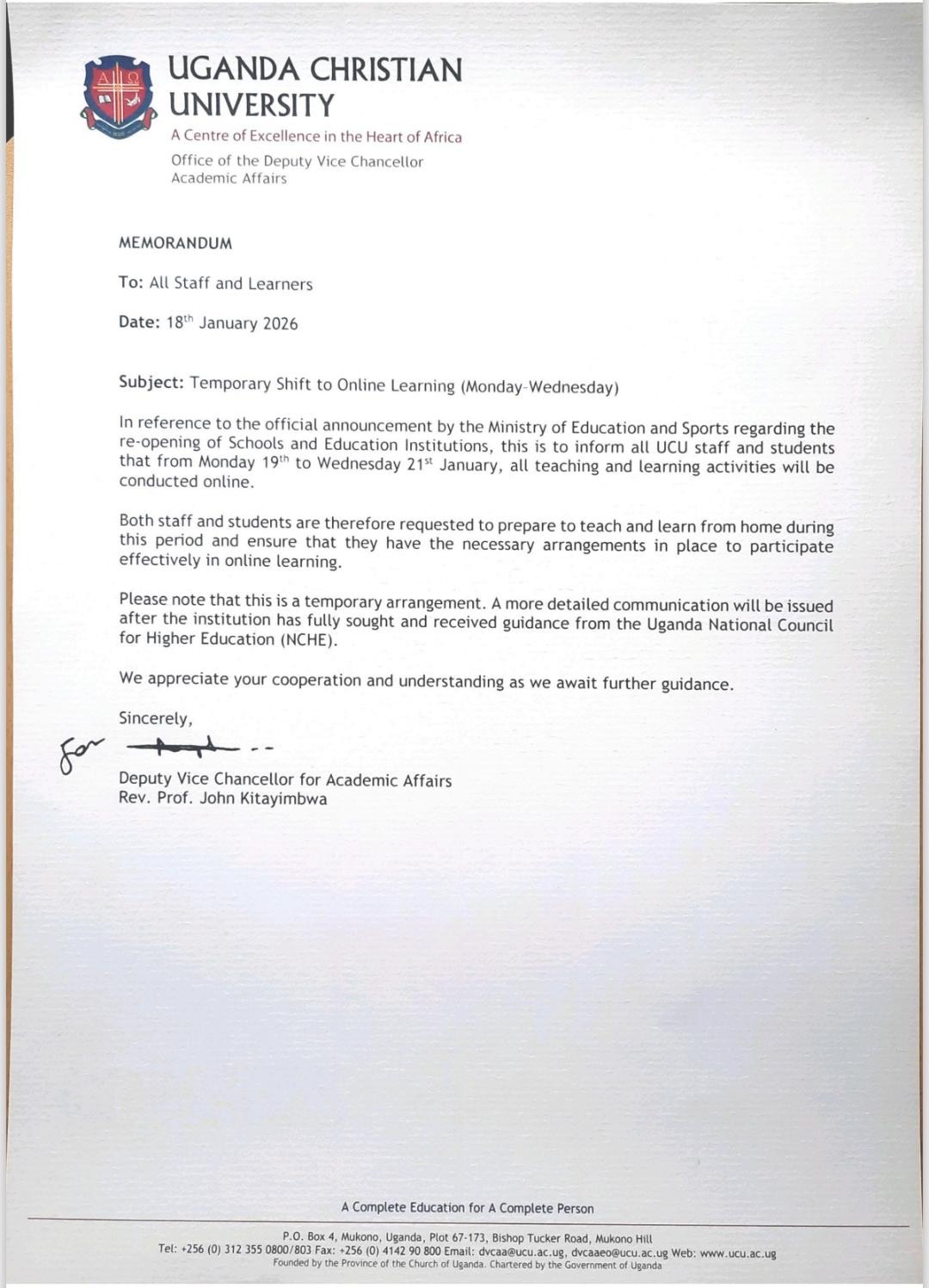Kitayimbwa, on Sunday, of a temporary shift to online learning from Monday to
